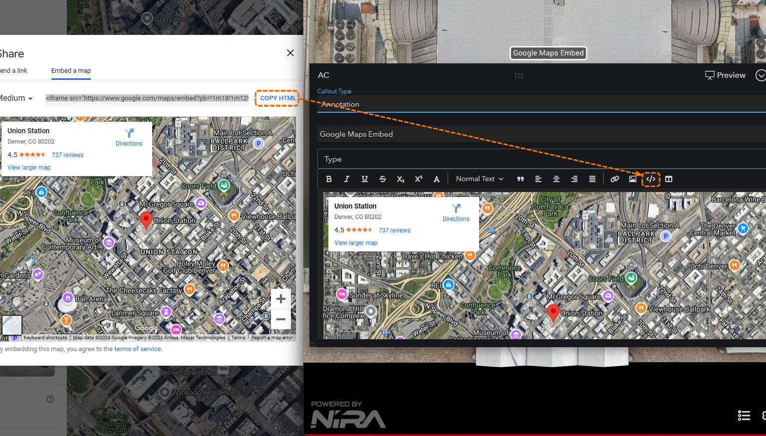 The Google Maps Share dialog will have two tabs: Send a link and Embed a map. Choose Embed a map to copy the COPY HTML and paste that into the Embed dialog box within the Callout Annotation.