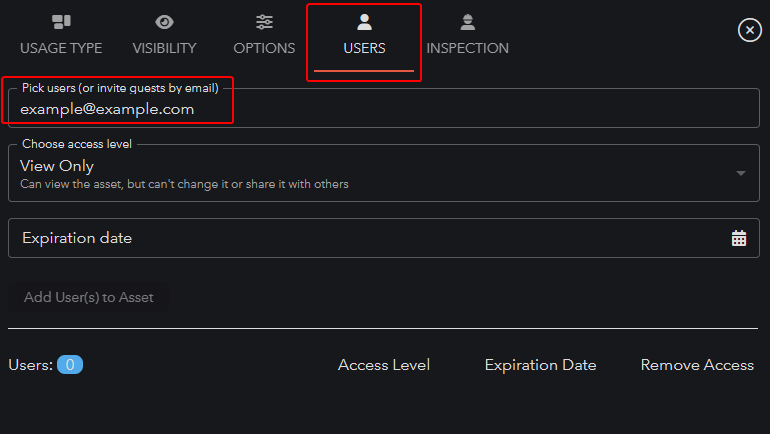 Admins and Team members can also add users by adding them to specific assets with the share dialog.