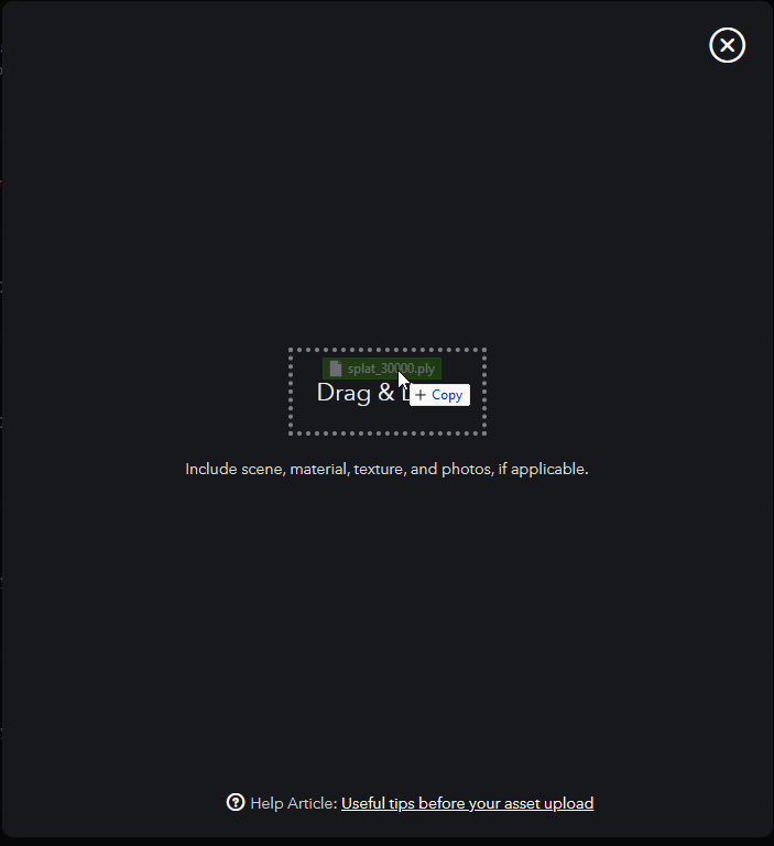 Uploading 3DGS .PLY files to Nira can be done by following the same steps as with any Nira upload. Simply drag and drop the file from your PC into the Nira web uploader window.