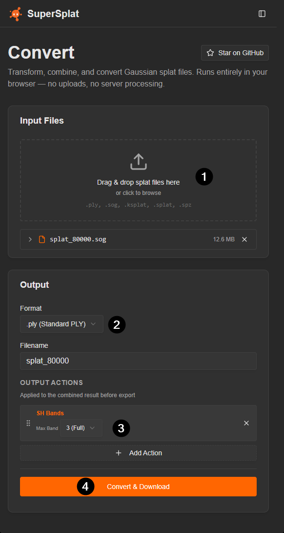 - Add an optional action to the conversion such as the removal of spherical harmonics to reduce file size.