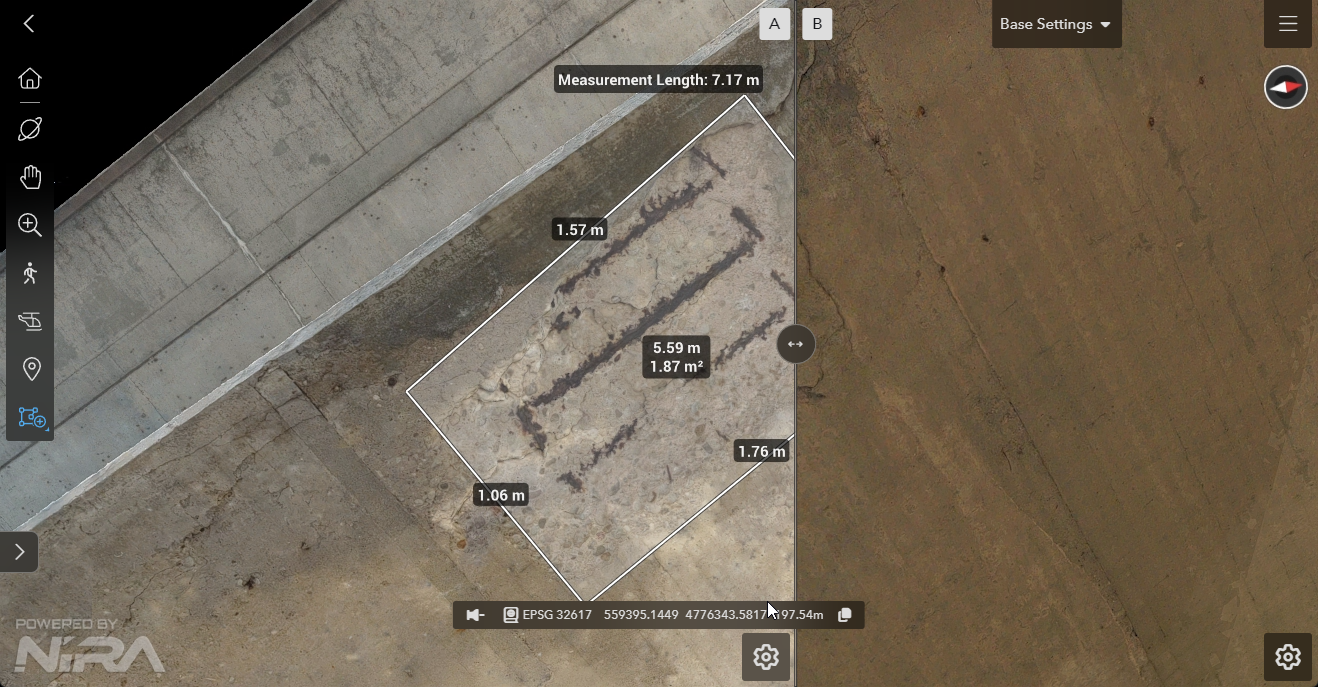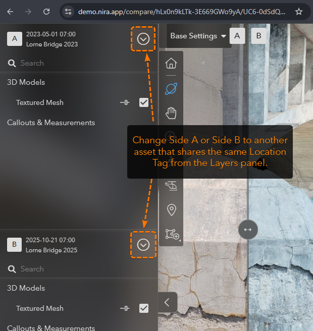 While in Compare mode, you can create Callouts and Measurements by clicking on either Side A or Side B to place them on the corresponding asset.